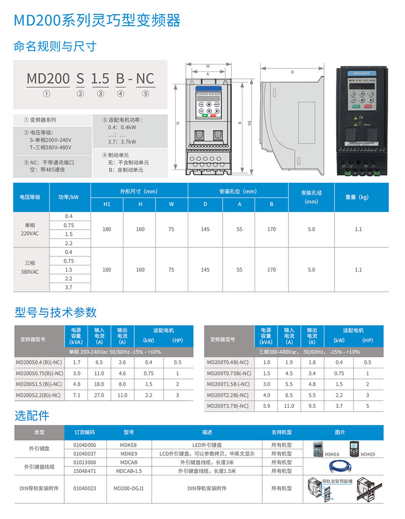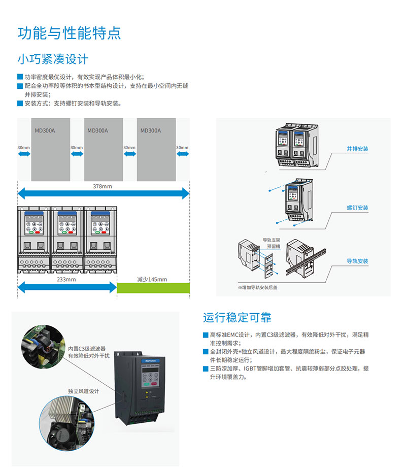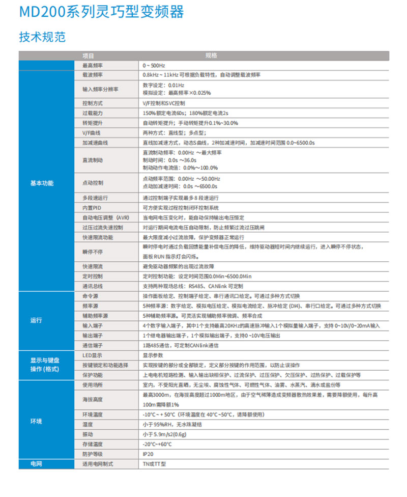 MD200 系列緊湊型變頻器是匯川技術(shù)基于小功率、小體積、低成本的市場(chǎng)需求,針對(duì)性推出的單相220 VAC 和三相380 VAC 迷你變頻器。MD200 采用V/F 控制方式、無(wú)速度傳感器矢量控制方式(SVC),具有高功率密度、高EMC 規(guī)格設(shè)計(jì)、高防護(hù)性能等顯著優(yōu)勢(shì)。